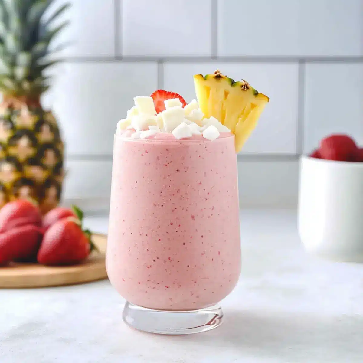 - Start by gathering your ingredients: 1 cup of frozen strawberries, 1 cup of frozen pineapple, ¼ cup of coconut flakes, ¼ cup of white chocolate chips, and 1 cup of unsweetened plant milk. In a high-powered blender, combine these items and secure the lid tightly. Blend on high speed for about 30 seconds or until smooth.