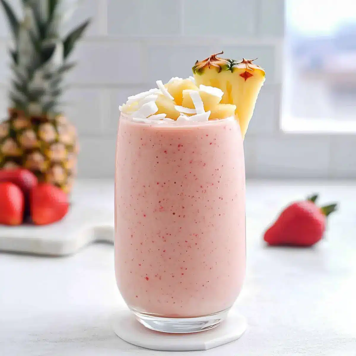 - Pour the smoothie into a tall glass. Optional: garnish with additional coconut flakes or fresh fruit slices. Enjoy immediately for the freshest taste!