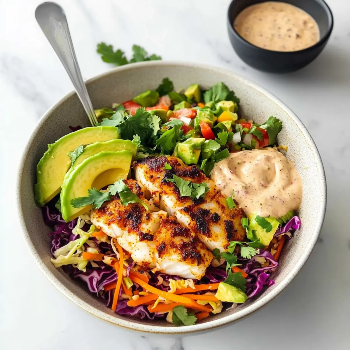 - Assemble the Bowls: Distribute the prepared slaw in serving bowls, layer with salsa, place a cod fillet on top, and garnish with avocado slices, lime wedges, and fresh cilantro.
