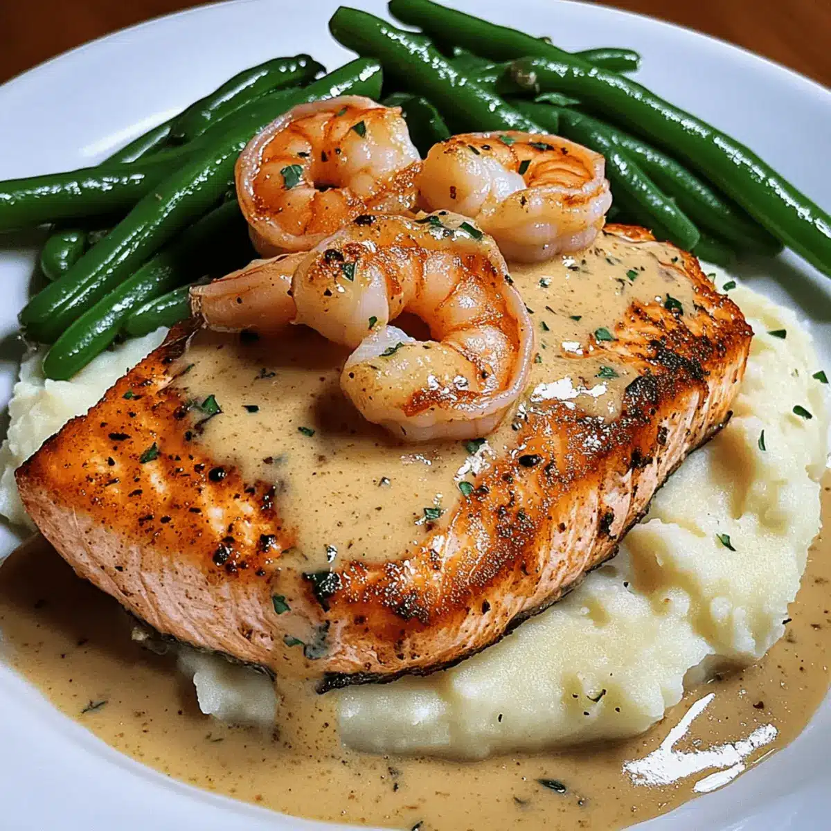 - To serve, place mashed potatoes, arrange green beans, top with Cajun shrimp and salmon, and drizzle with the garlic cream sauce.