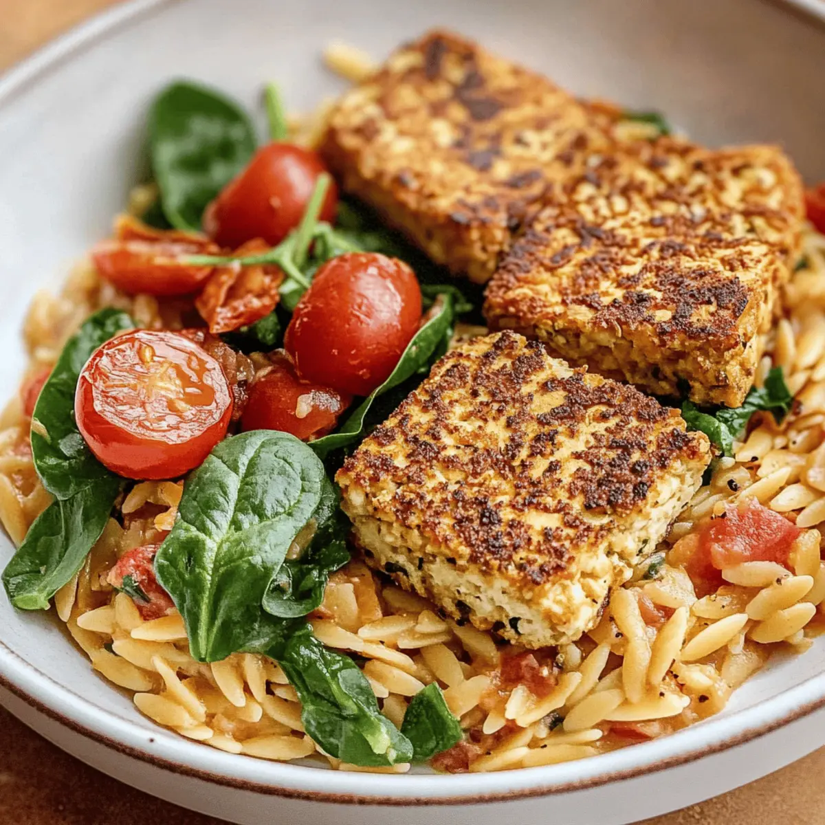 Creamy Tomato Orzo with Crispy Tofu Cutlets in 30 Minutes