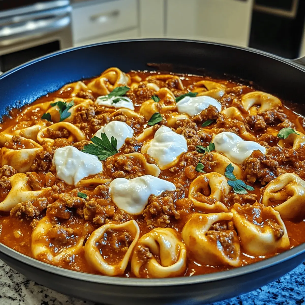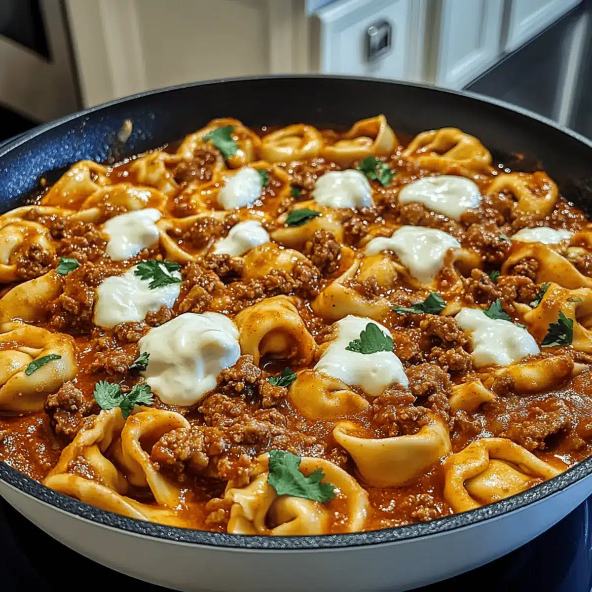 Gently fold in 12 ounces of cheese tortellini into the skillet, ensuring each piece is coated in the cheesy sauce. Heat for another 5–7 minutes, stirring occasionally until the tortellini is tender and warmed through, soaking up all the flavors from the cheesy beef mixture.