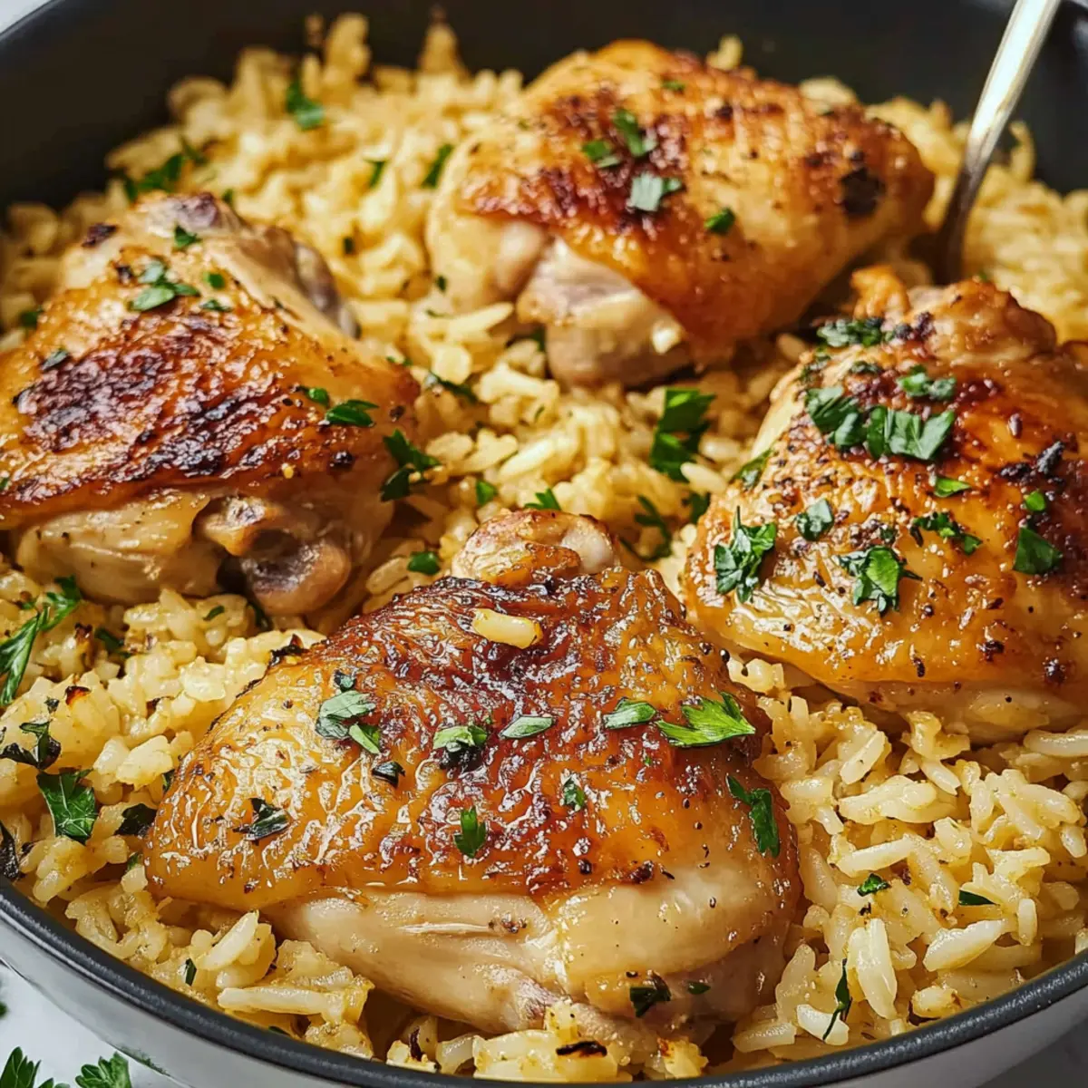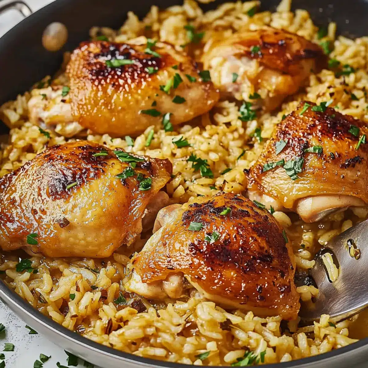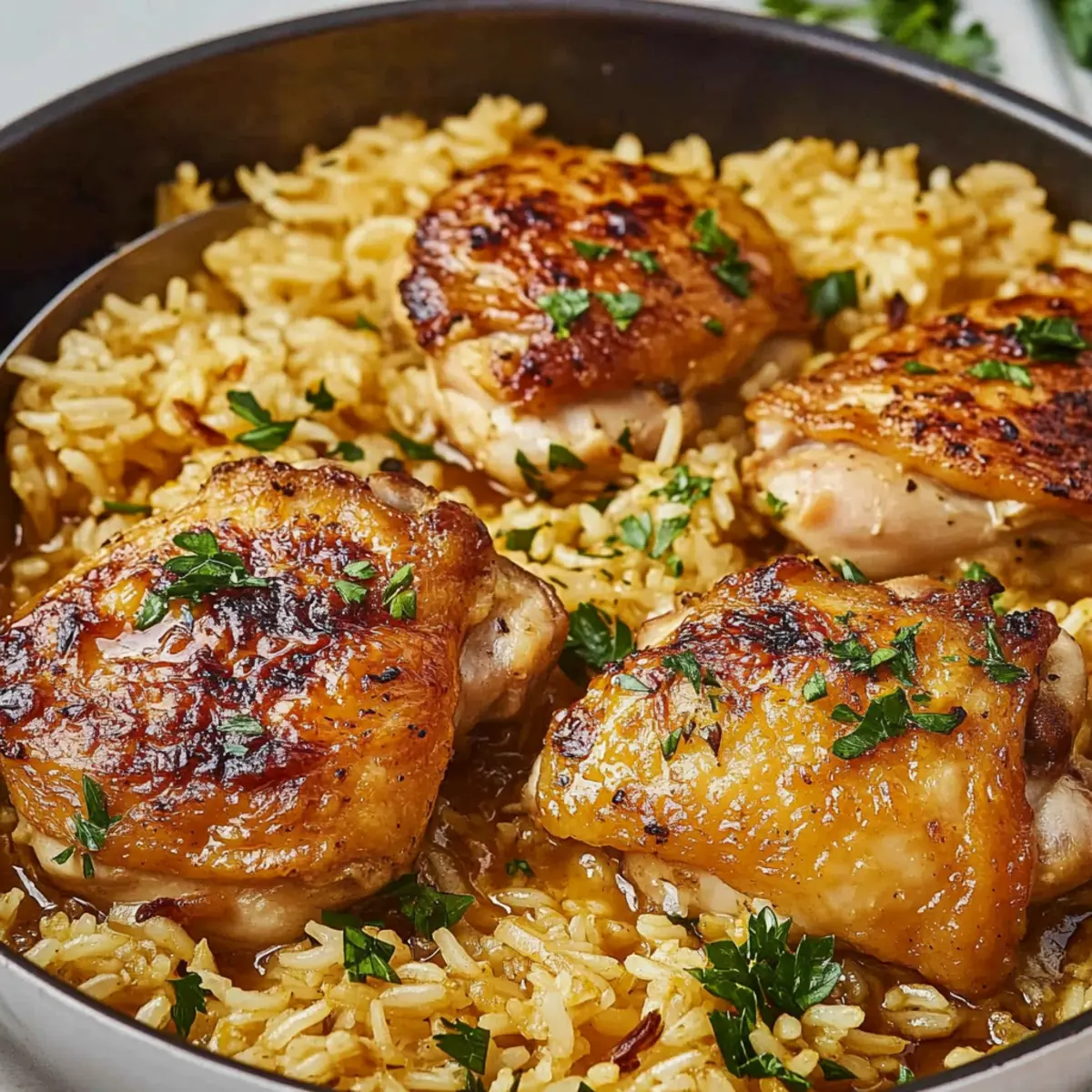 - Remove the skillet from heat and let the dish rest for a few minutes, allowing the flavors to meld. Garnish with extra fresh parsley for a pop of color and freshness. Now it's time to serve your comforting One-Pan Chicken Thighs and Garlic Rice, perfect for gathering everyone at the table!