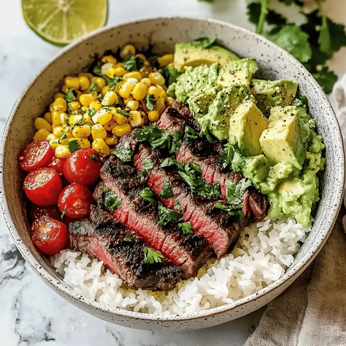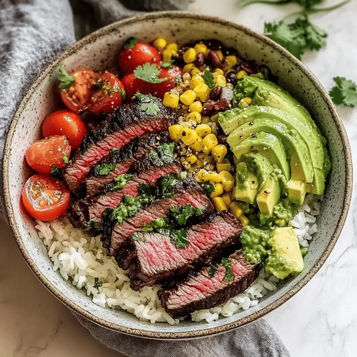 - Start by dividing the fluffy rice among serving bowls as the base. Layer on the warmed black beans and corn, followed by chopped cherry tomatoes, diced avocado, and sliced red onion. Finally, top each bowl with the sliced grilled steak and, if desired, crumbled feta for a creamy contrast. Garnish with extra cilantro and serve with lime wedges for an extra zesty kick.