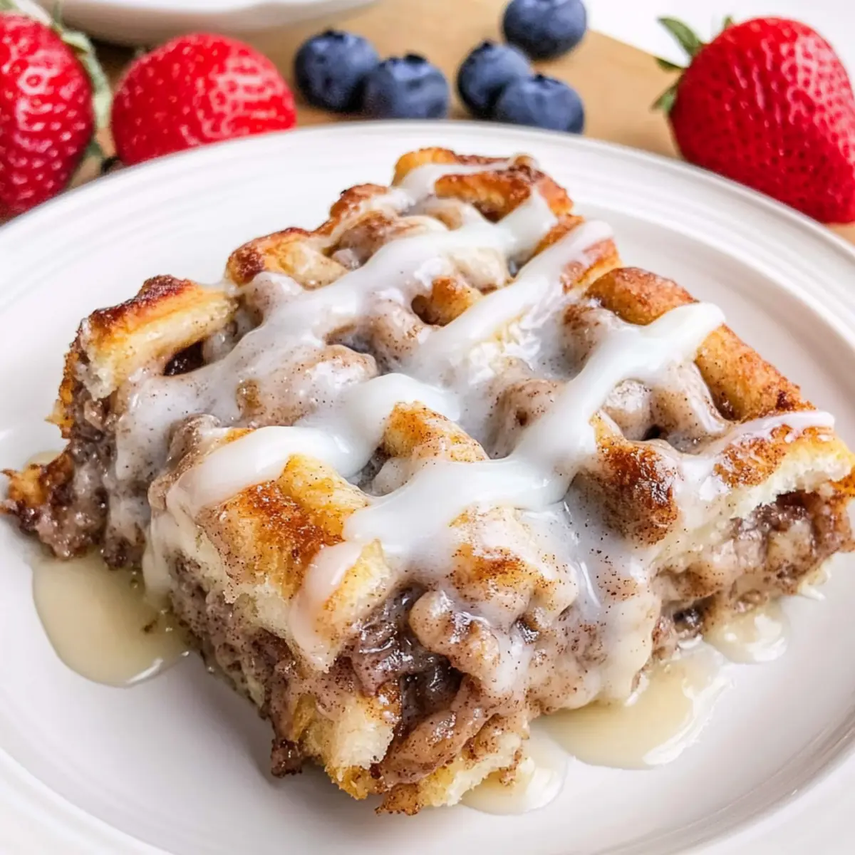 - Drizzle warm maple syrup and cinnamon roll icing over the casserole, cool for 5–10 minutes, slice, and serve warm.