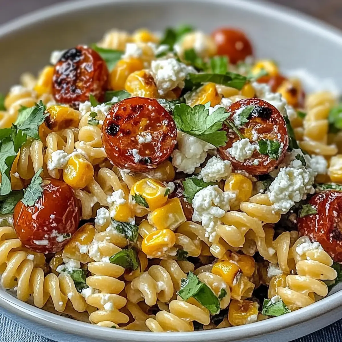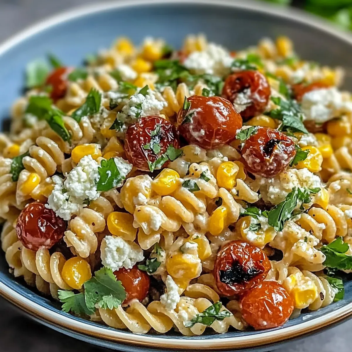 - Combine Ingredients: Fold pasta into the dressing; add charred corn, cherry tomatoes, red onion, cilantro, jalapeño, and Cotija cheese. Mix gently until coated.