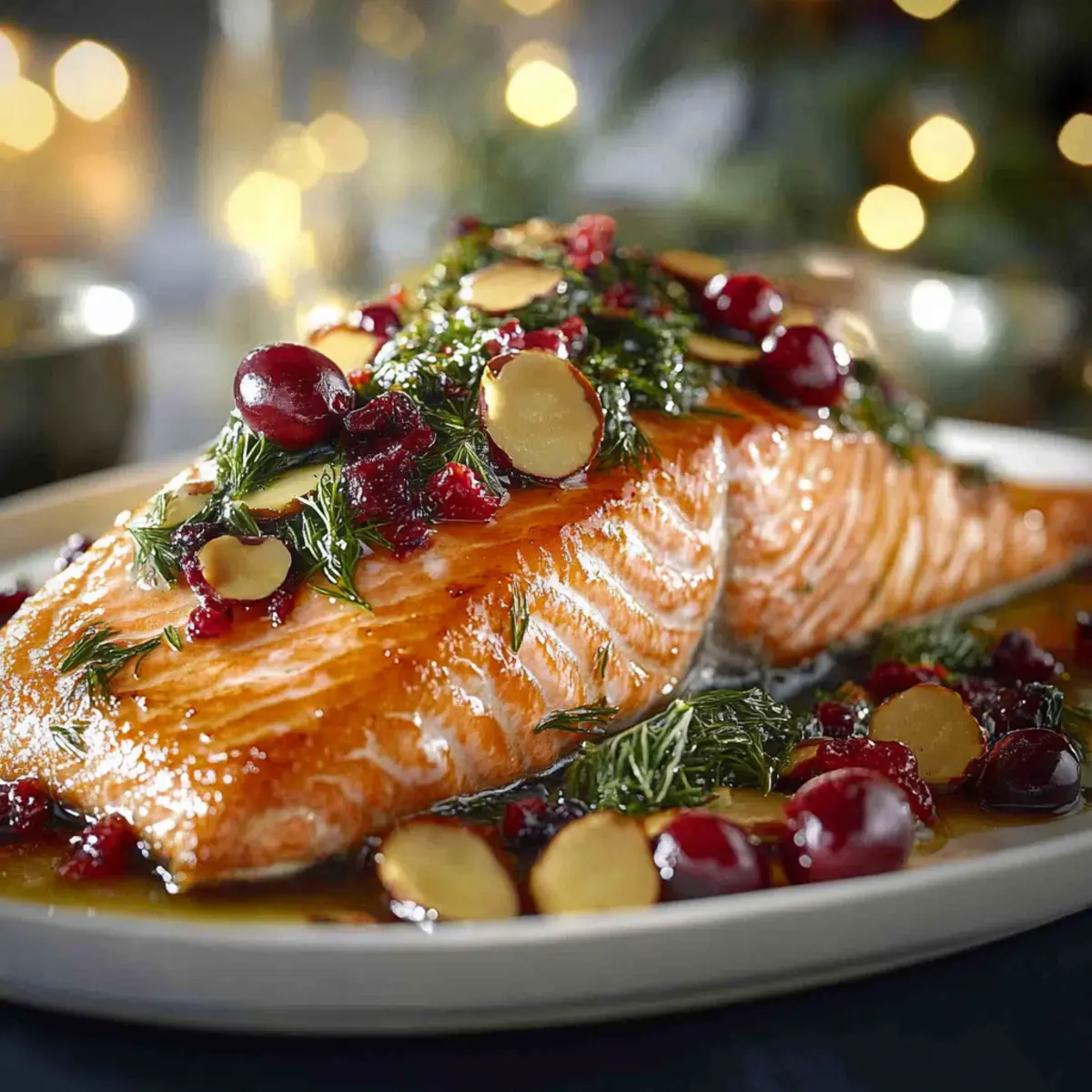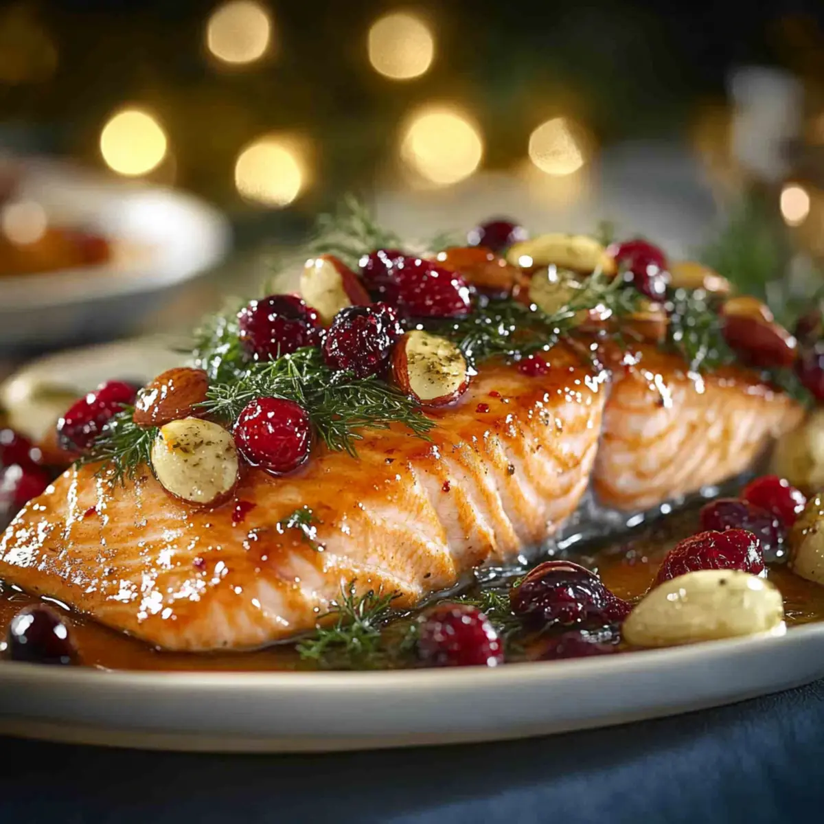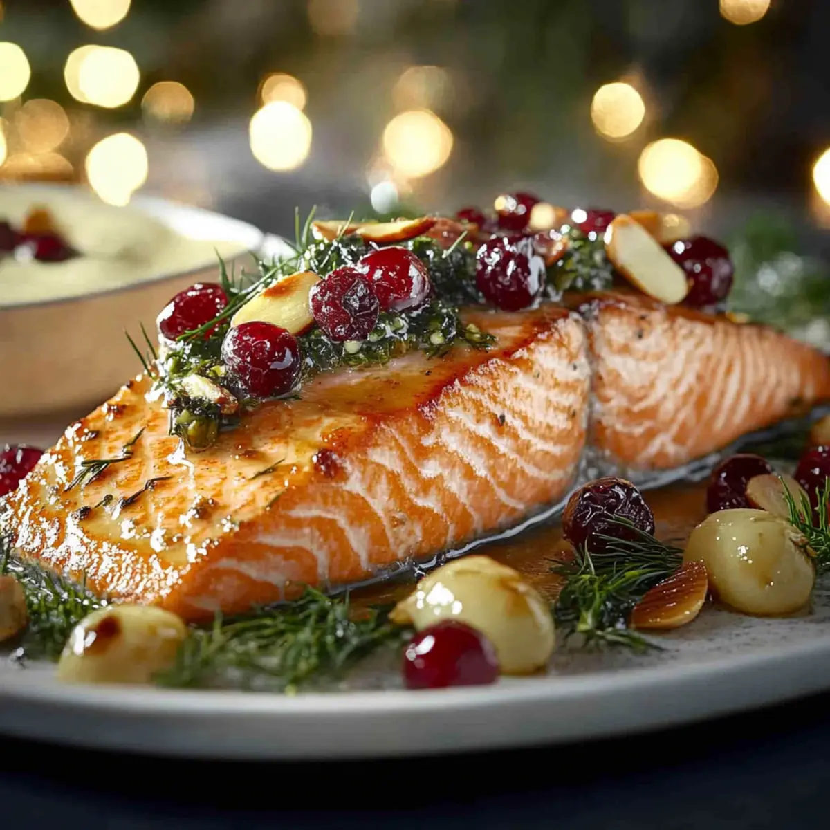 Once the salmon is perfectly cooked, transfer it to a serving platter with a spatula. Spoon the refreshing dill sauce alongside the salmon and then sprinkle the cranberry-almond topping generously over the fish. Garnish your dish with fresh herbs or citrus slices for an added festive touch.