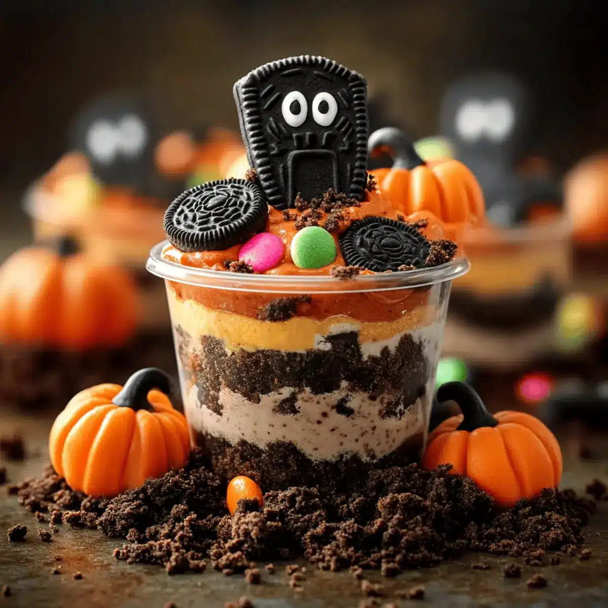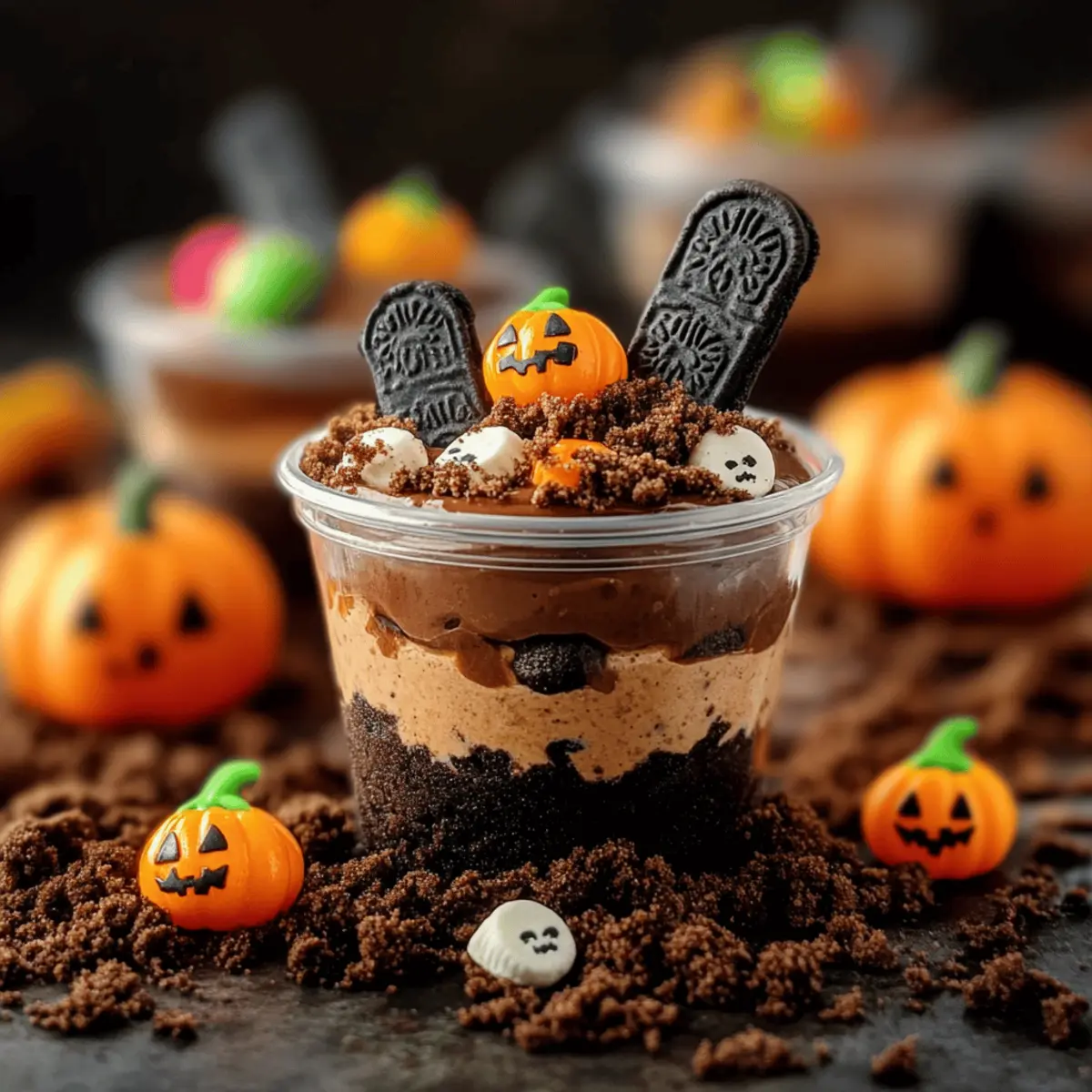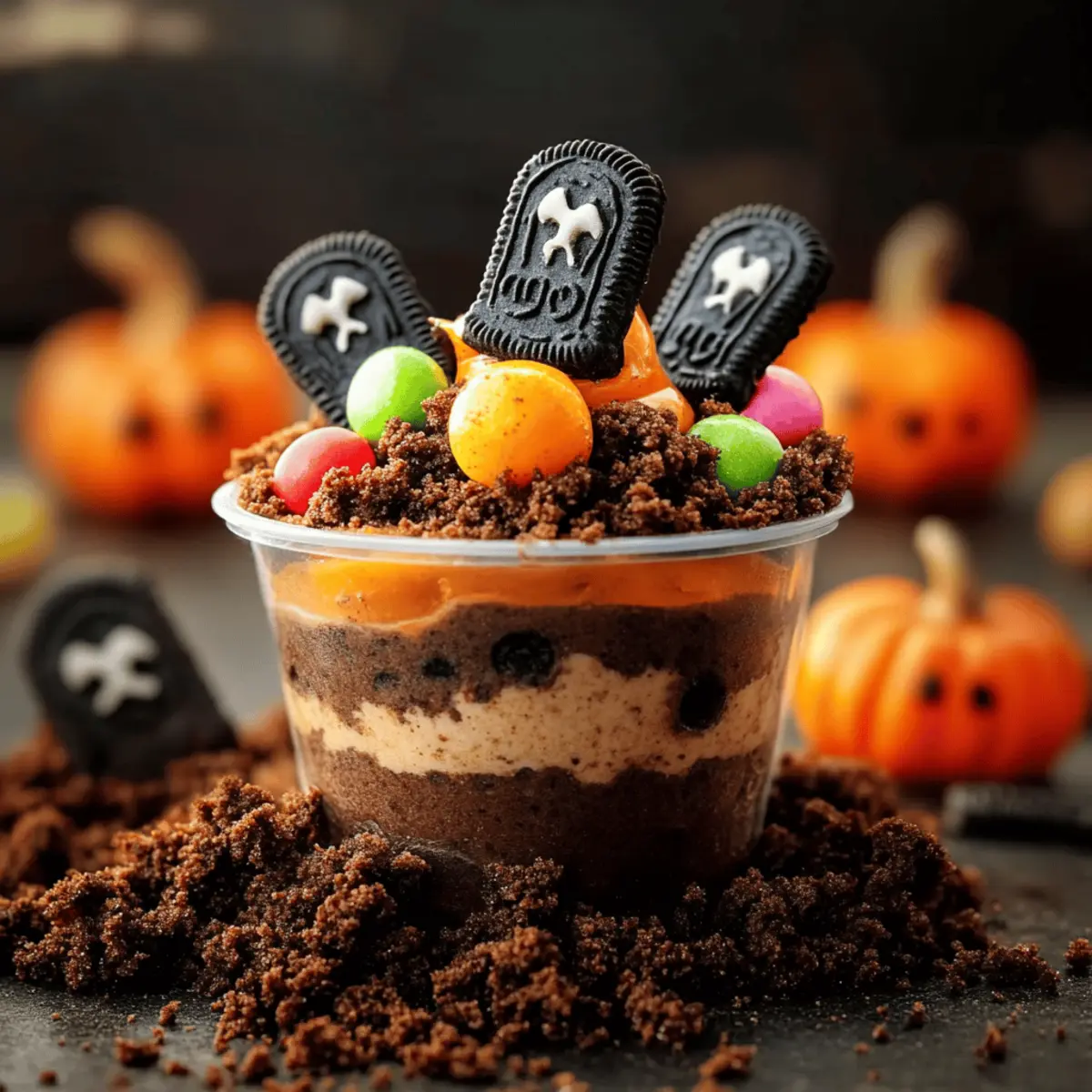 - Decorate the Cups: Insert a cookie tombstone into each cup and add a candy pumpkin and gummy worms for decoration.