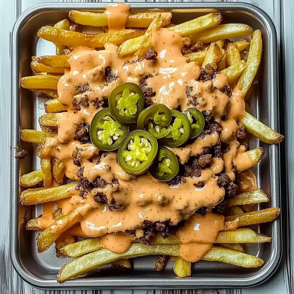 Once everything is heavenly hot, drizzle the dish with Thousand Island dressing for that extra zing. Top off with crunchy pickles and jalapeños for heat. Feel free to add more toppings like chopped tomatoes or avocado to personalize your Hearty Smash Burger Fries experience, making each bite truly your own!