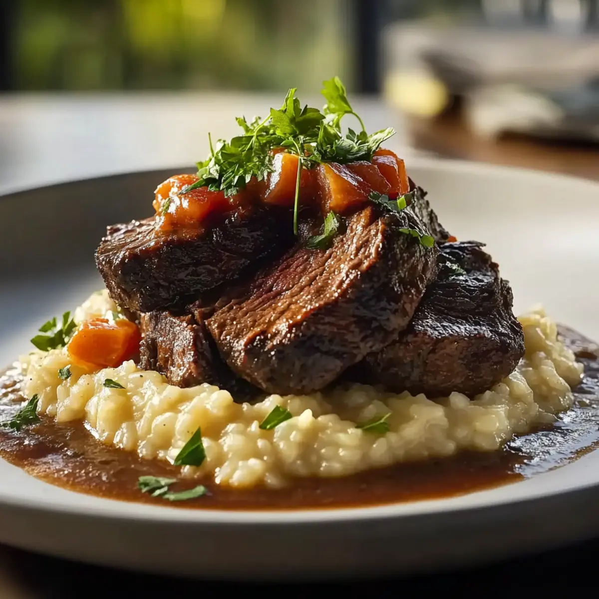 - To serve, slice the pot roast and plate with creamy risotto. Drizzle with sauce and garnish with parsley.