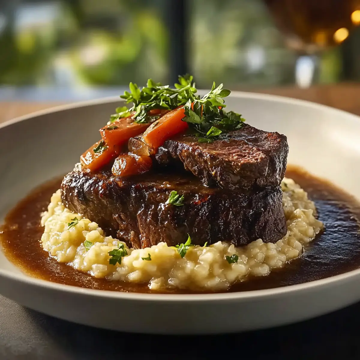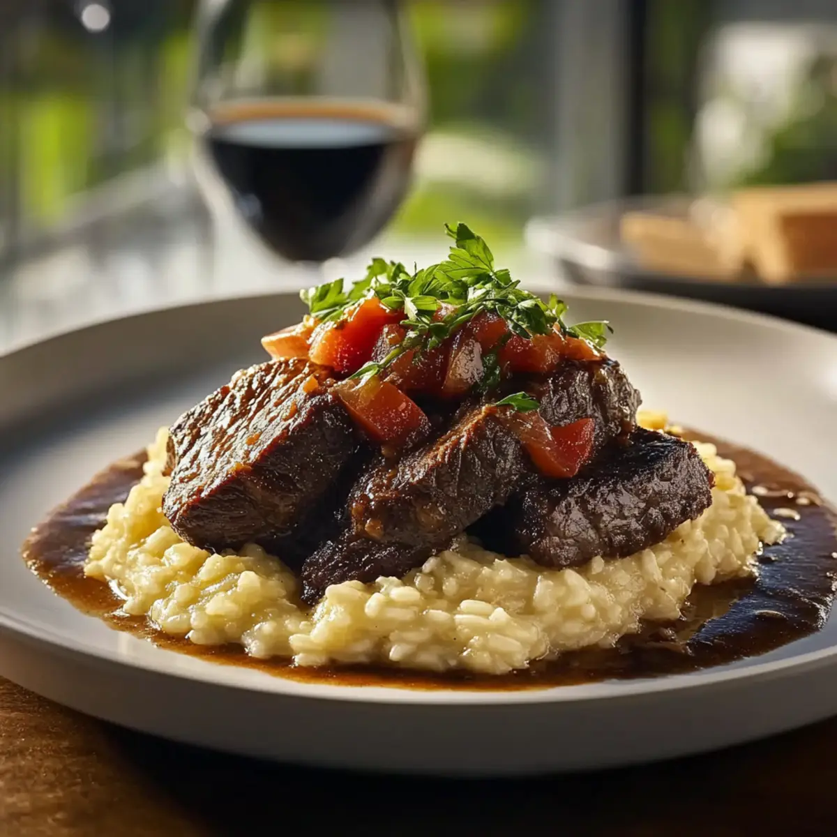 Flavor Explosion: Tender beef bathes in rich flavors from red wine and Italian herbs, while the creamy risotto adds a heavenly touch.