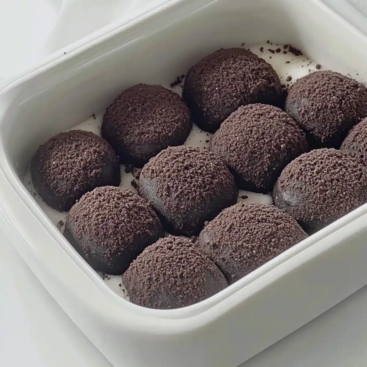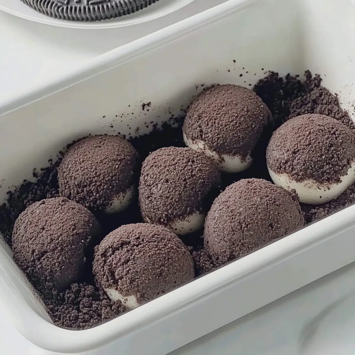 - Crush the Oreo cookies into fine crumbs and roll each mochi ball in the crumbs until fully coated.