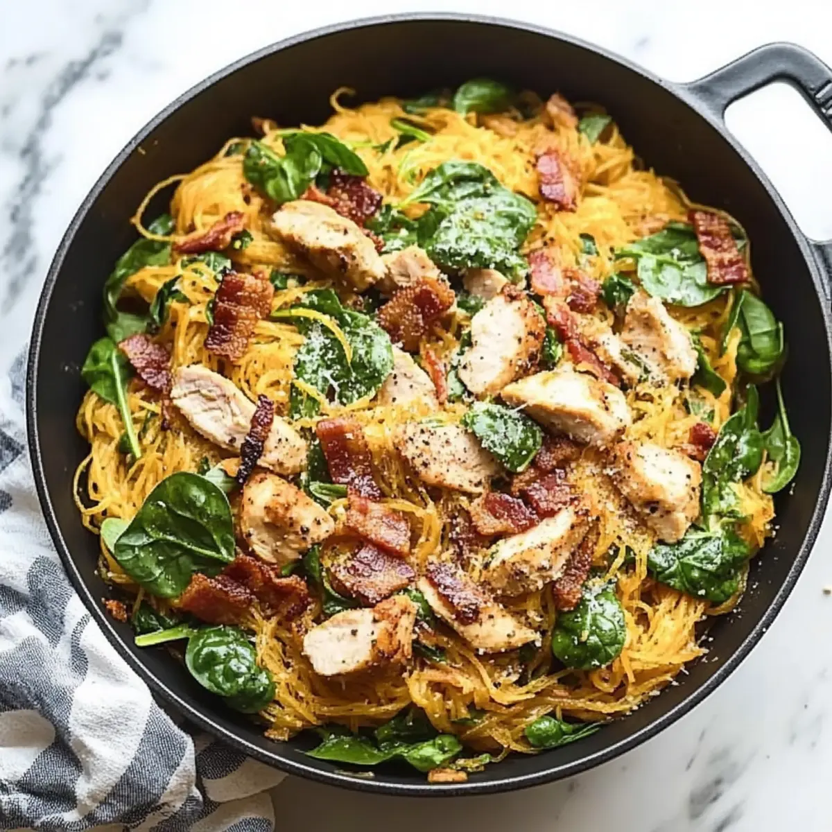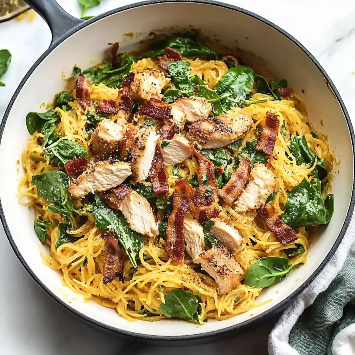 Stir in the fresh spinach, allowing it to wilt into the warm mixture. Then, add the cooked bacon and sliced chicken back into the skillet, mixing everything together to combine the flavors thoroughly in your Spaghetti Squash Carbonara.