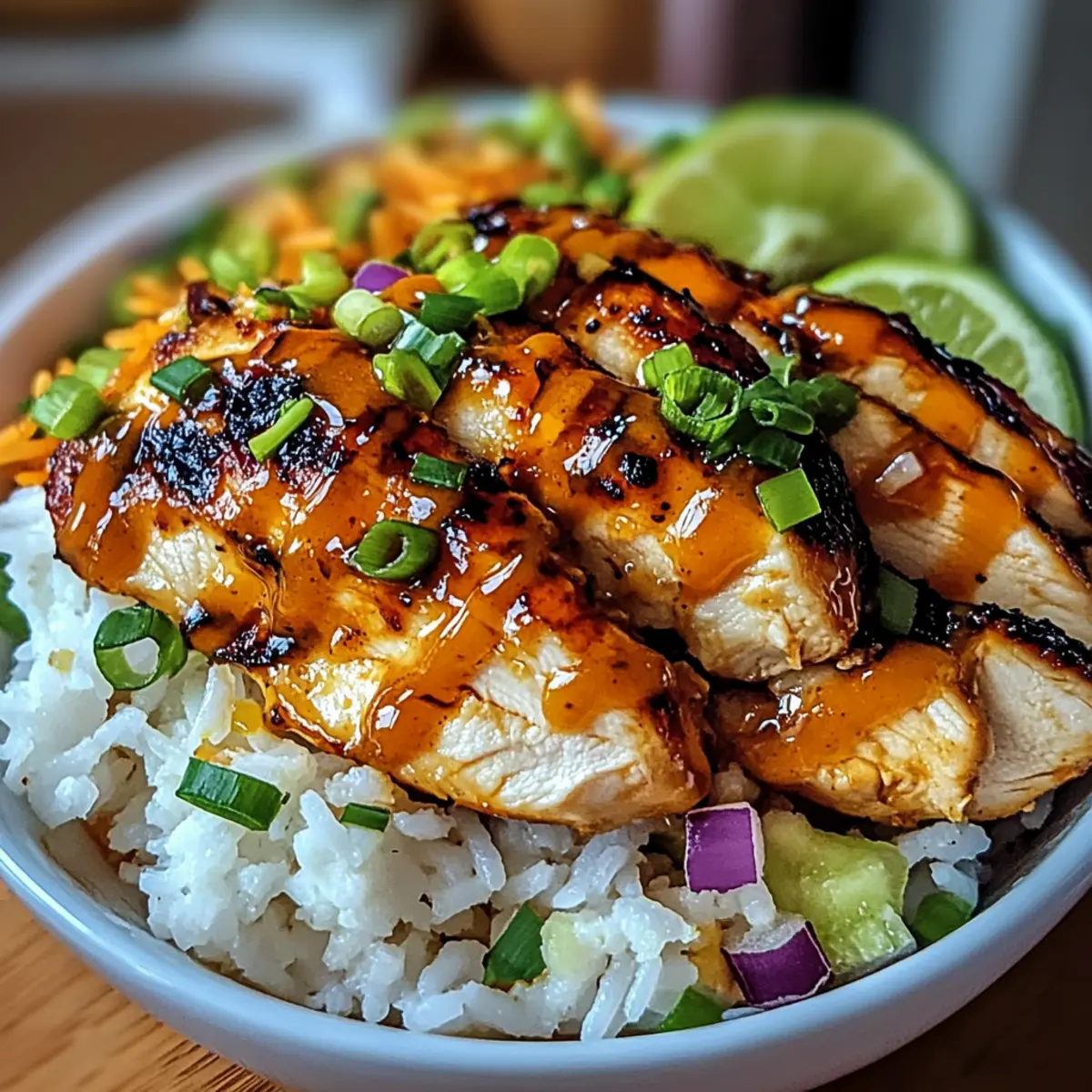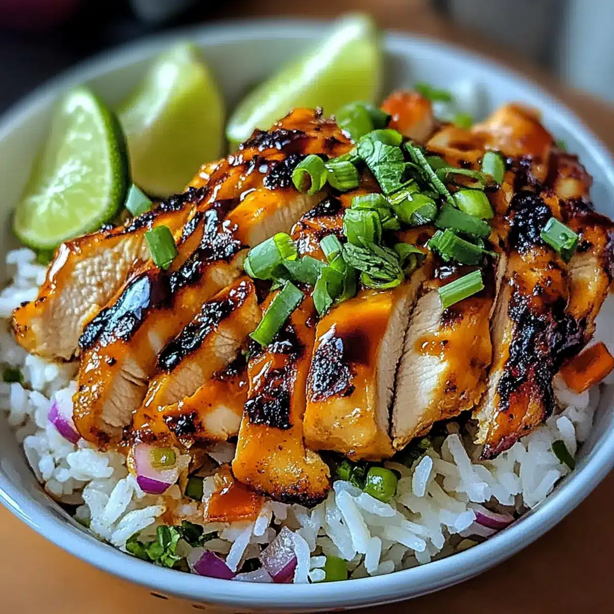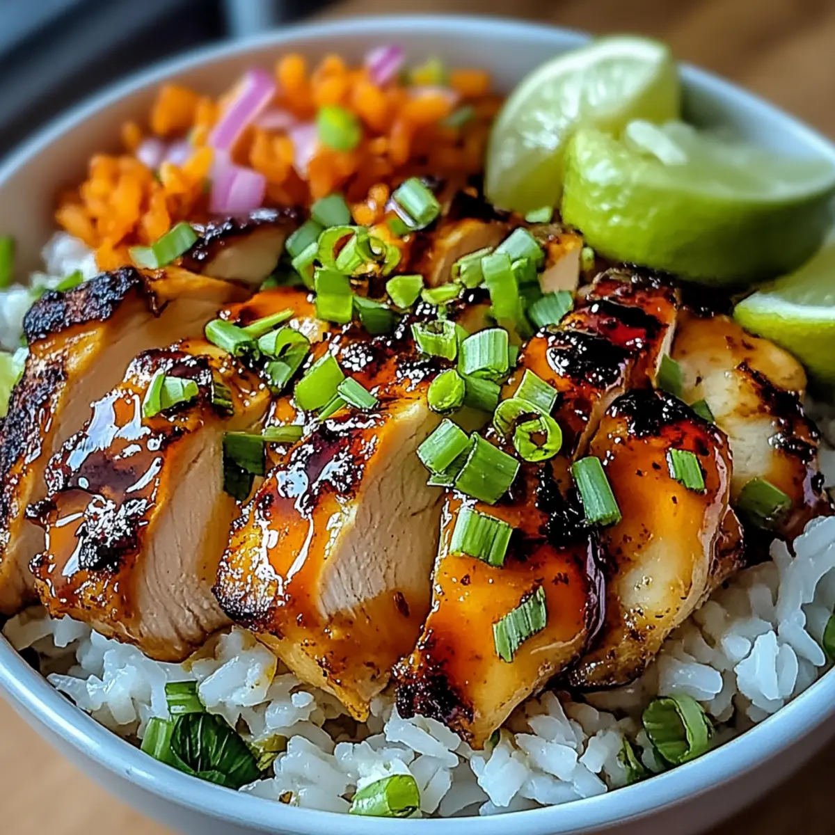 - Spoon rice onto plates and top with glazed chicken. Garnish with sliced green onions and lime wedges.