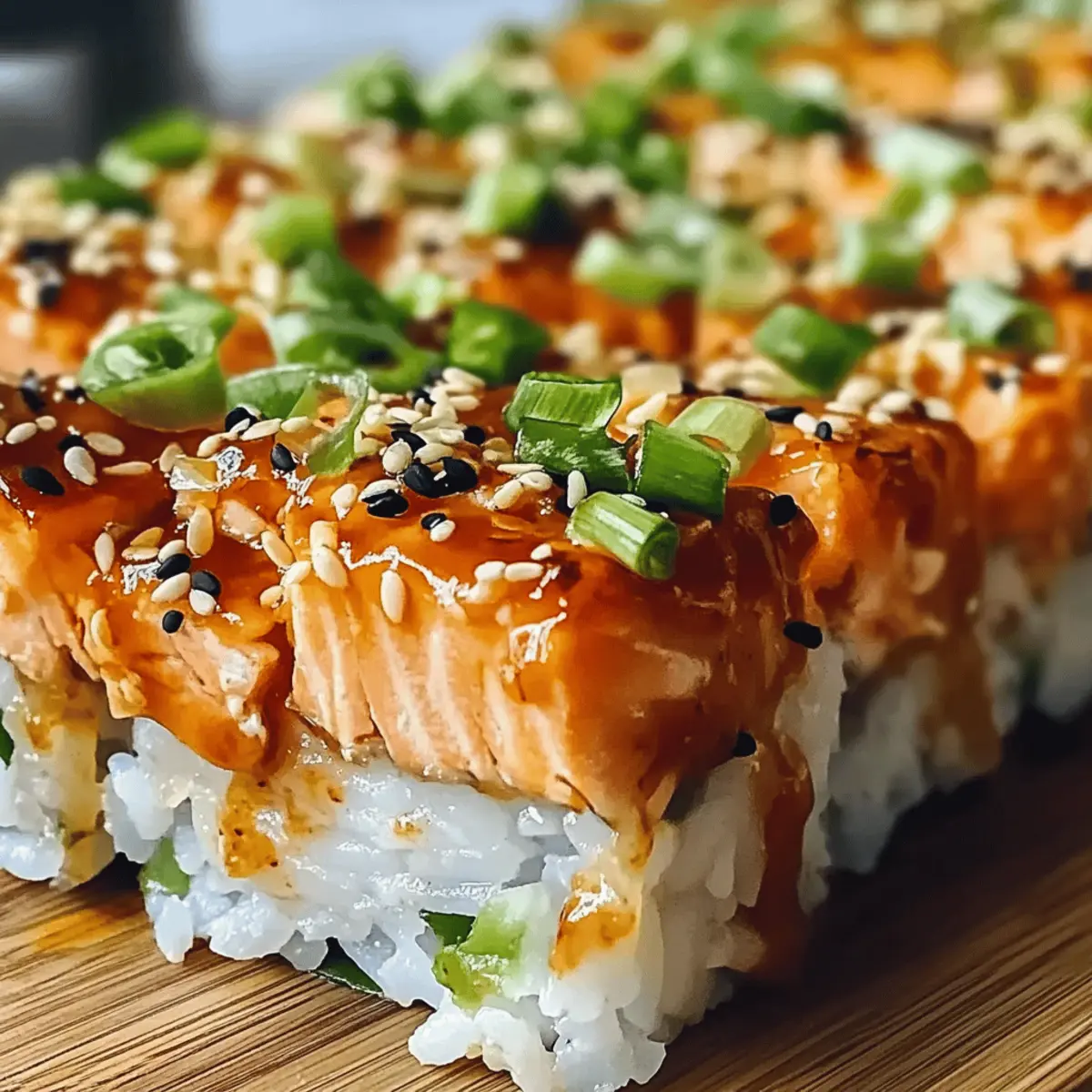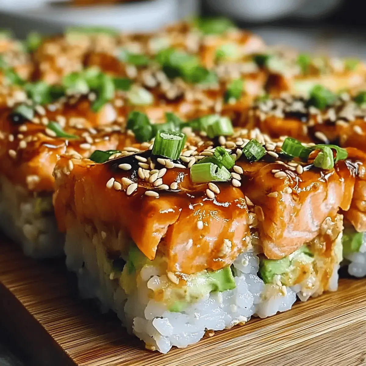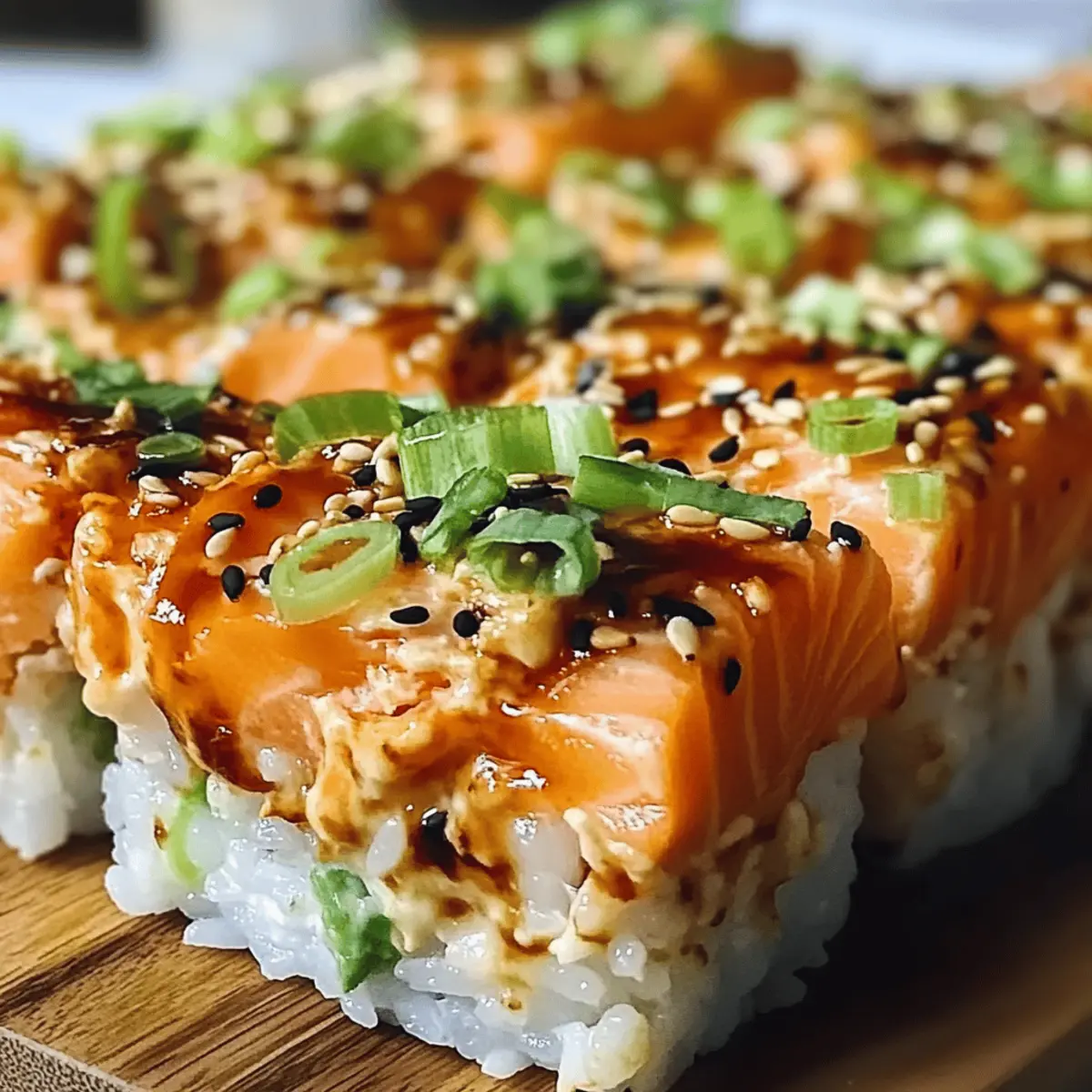 Once baked, allow the dish to cool for a few minutes to avoid burns from the hot cheese. Garnish the top with freshly sliced green onions and sprinkle with toasted sesame seeds for added flavor and crunch. Serve warm alongside roasted seaweed for scooping, letting everyone dig into your scrumptious Spicy Salmon Sushi Bake!