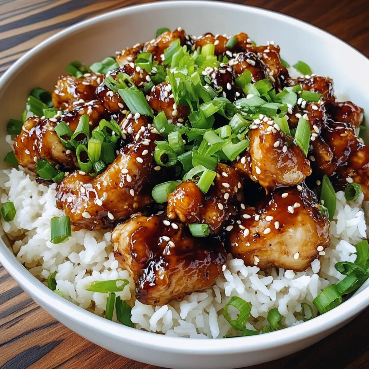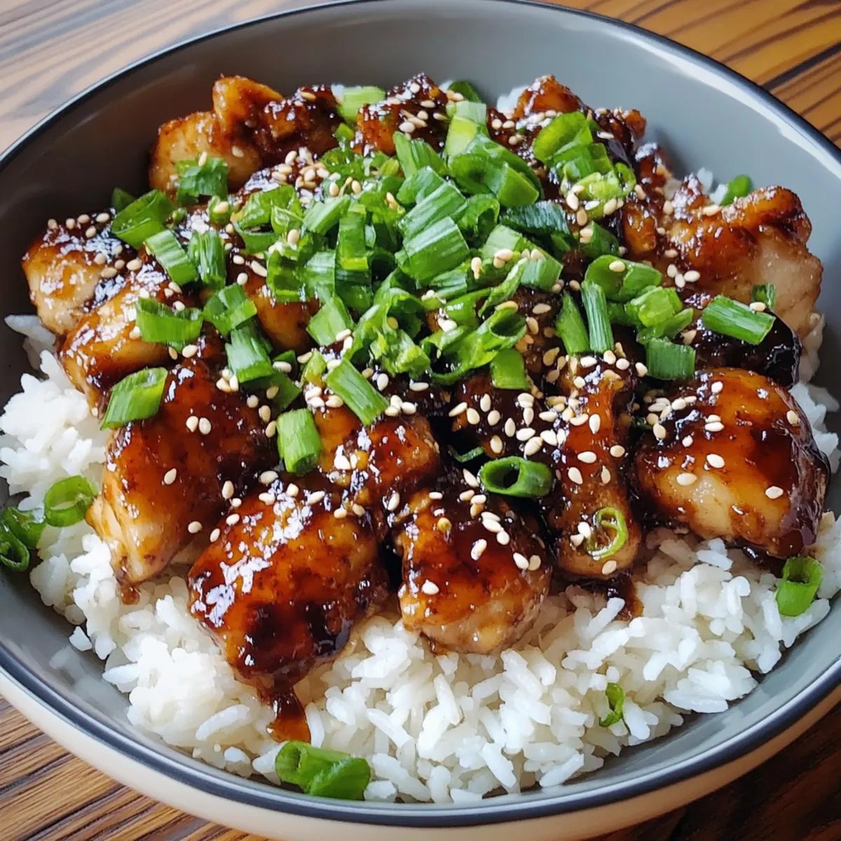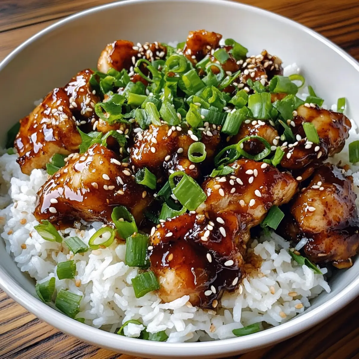 - Serve & Garnish: Scoop rice into bowls, top with chicken, drizzle glaze, and add garnish.