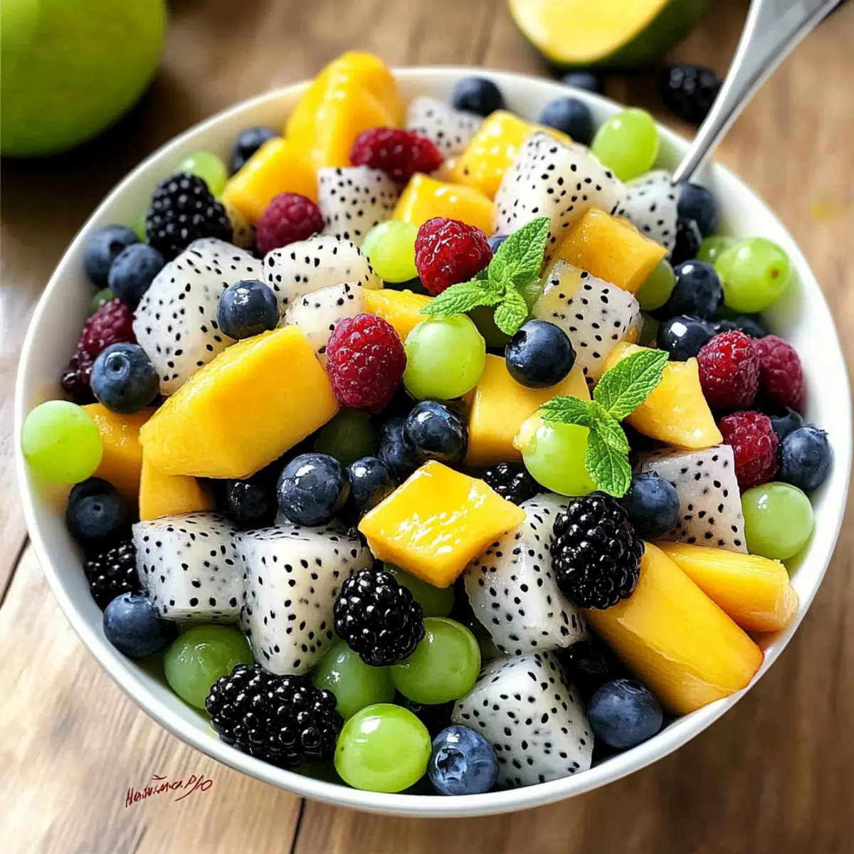 Absolutely! When selecting fruits like mangoes and dragon fruit, look for ones that yield slightly to pressure and have a vibrant color. A ripe mango should have a sweet aroma at the stem and be free from dark spots. Green grapes should be firm and crisp, while blueberries and blackberries should be plump and have a deep color. Fresh peaches are a great alternative for mangoes, ensuring they’re slightly soft but not mushy.