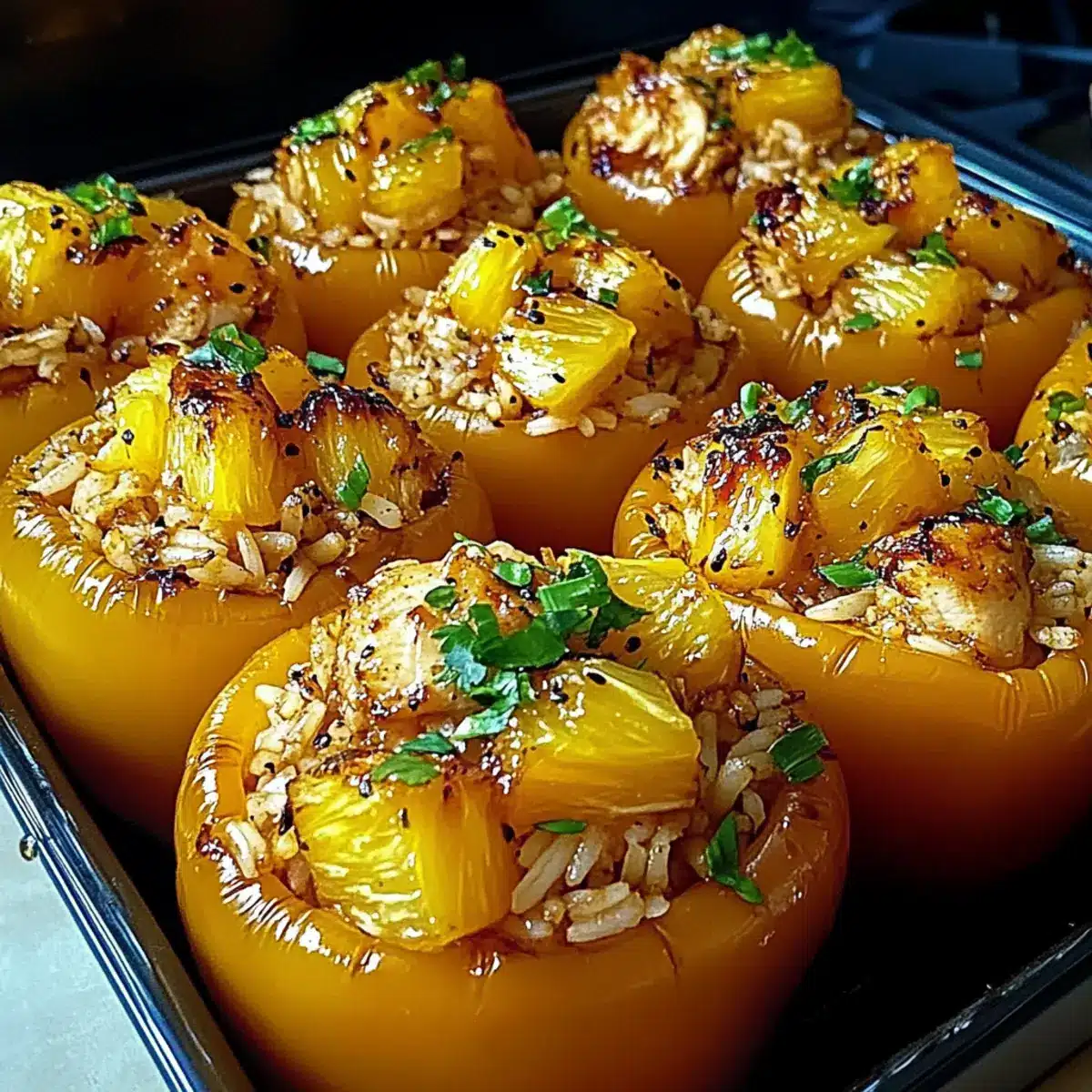 Once baked, remove the stuffed peppers from the oven and let them cool for a few minutes before serving. This brief cooling period makes handling easier. Optionally garnish with extra pineapple or finely chopped green onions for added color and freshness, complementing your Teriyaki Pineapple Chicken and Rice Stuffed Peppers perfectly.